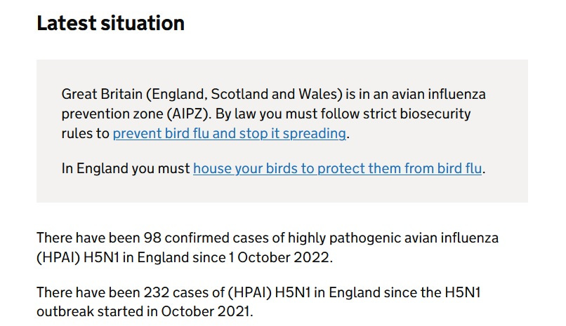 The disease shows no sign of retreating. There have been 98 confirmed cases of highly pathogenic avian influenza (HPAI) H5N1 in England since 1 October 2022. With migration underway and huge numbers of ducks and geese arriving from as far away as Russia, the warnings have increased and measures to stop the spread (according to the government anyway) stepped up. In October a lockdown of sorts was imposed when biosecurity measures in the form of an Avian Influenza Prevention Zone (AIPZ) were brought in. On November 7th the government went further, declaring mandatory housing measures which meant that “all poultry and captive birds must be housed in England until further notice”.