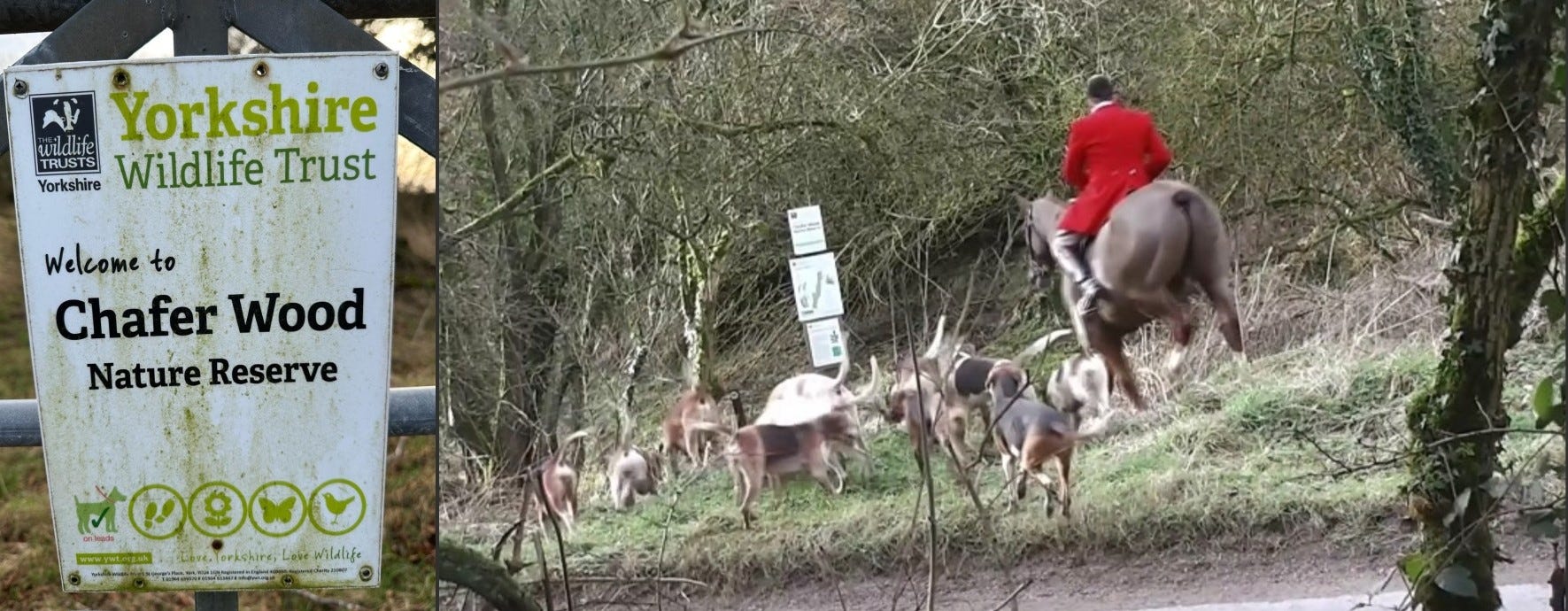 On Saturday 27 January this year, North Yorkshire's Derwent Hunt was filmed riding with hounds into Chafer Wood, a Yorkshire Wildlife Trust (YWT) Nature Reserve which is described as "young woodland and scrub, where small open glades contain limestone grassland". Chafer Wood is open to the public who (when there's not a hunt charging through it) can enjoy "an uplifting and invigorating walk ...and take in the breath-taking views across the Vale of Pickering". It is not open so that an entitled hunt can trespass, cause damage to the woodland floor, drive a quad bike through sensitive habitat, and loudly search the reserve for foxes to chase.