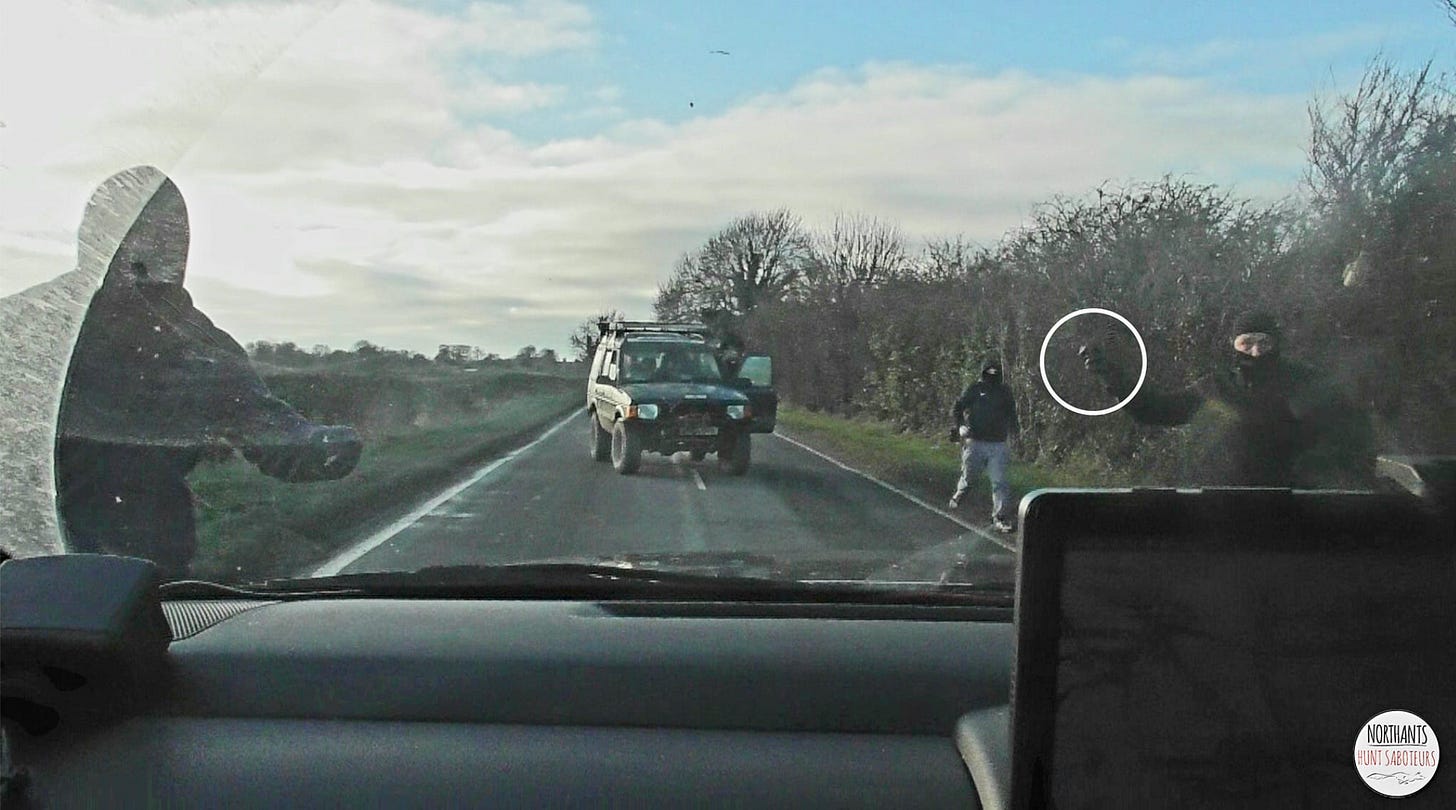 "As sabs monitored their movements, the Cottesmore’s hired henchmen came down the Colsterworth road just east of Stainby and blocked all traffic. Again, balaclava wearing thugs exited the vehicles, spilt out across the road and ran towards our vehicle. Blocked from the rear also, sabs tried to move forward surrounded by the mob. A hammer went into the windscreen as the vehicle’s wing mirror was ripped off. Again, the Cottesmore’s gang desperately tried to get into the vehicle and the sabs inside. For the third time that day some inspired driving got sabs around the blocking vehicle and away."