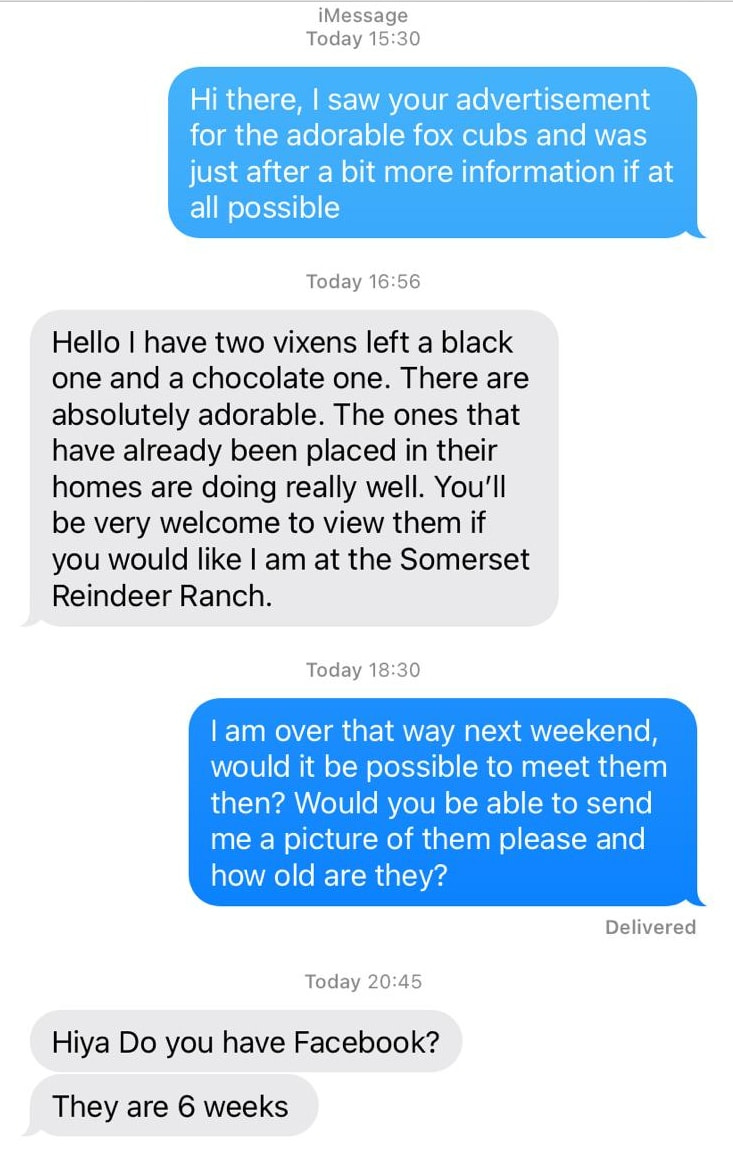 "When it first came to my attention that Sarah Sutton of Reindeer Ranch was breeding fox cubs I was interested if she has a licence for breeding and selling animals and she didn't at that time. I am waiting for a response from Somerset licensing department to see if she has applied for one now, as I currently have proof of her also selling baby skunk."