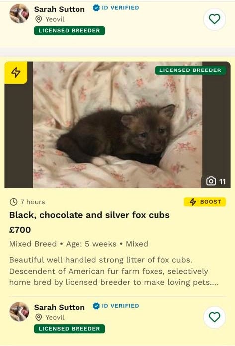 One sab discovered that Sarah Sutton, who runs the ranch, was advertising the foxes online to sell for £700 each.