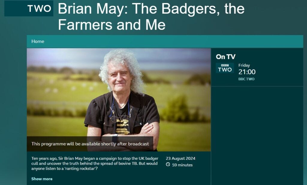 Bless Brian May (one of the only celebrities I have the most complete and up most respect and admiration for) and good on everyone involved with helping to make this film possible 👍👏❤️!! Thank you all 💖!! Bovine TB is NOT "caused" by innocent badgers, it is caused by the atrocious and disgusting squalid factory farming conditions the poor cows are forced to endure existing in and the way they are freely bought, sold and moved all around the country like mere items. THAT is how bovine TB is spread!!! Isn't it also a "funny" coincidence how if humans get TB, they get antibiotics and treatment for it but when sweet cows and alpacas like Geronimo "supposedly get it" (NOT in Geronimo's case!!), the ONLY answer they are given is an execution order, even for cows and camelids living in sanctuaries 😾😡🤬🤬🤬!!! Humans aren't handed a mandatory death sentence for contracting it, why should it be any different for cows and camelids, even if the owner WANTED to pay for their treatment, but the government wouldn't have it 🤬🤬🤬!!!!! Sadly, I don't know whether I will be able to watch the film myself as if it features poor dead badgers or badgers being murdered, I just can't bear seeing that with any animal 😿😿💔💔. I just don't know how the brave sabs and undercover investigators for animals do it. They are far stronger and braver than me. I sincerely hope that Labour MP's and members watch this though and more importantly, ACT on it the right way by ending this completely uneccessary, totally barbarically and undeniably flawed "cull" right NOW, not in 3/4 years time 😾😡🤬🤬!!!