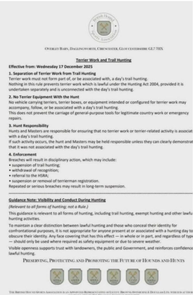 The BHSA says that hunts will be suspended from ‘trail hunting’ if they break the rules. The Association says that in the future ‘trail hunts’ should not be seen going out equipped for terrier ‘work’ with quads and terriers and that hunt staff should not wear masks (as terriermen typically do to avoid identification and prosecution) except for “safety purposes” or during “severe weather”.