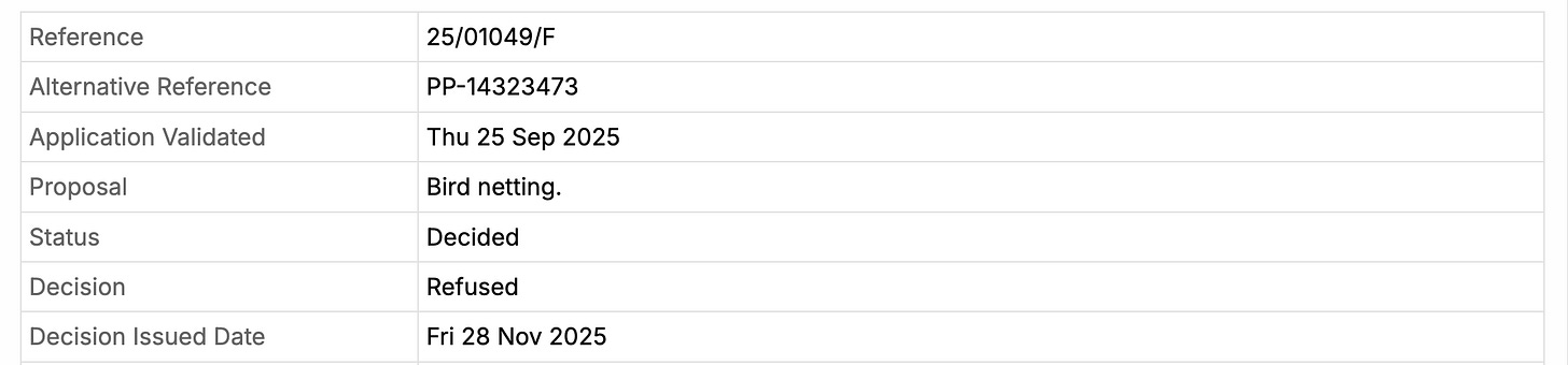 First up, we have just found out that Norwich City Council has refused Barclays’ application to install bird netting at their premises! The council said Barclays failed to show the netting wouldn’t harm wildlife or protected species, so the risk to birds was unacceptable. And on top of that, they ruled the netting would visually damage a locally important heritage building and the wider conservation area, with no public benefit strong enough to justify it.