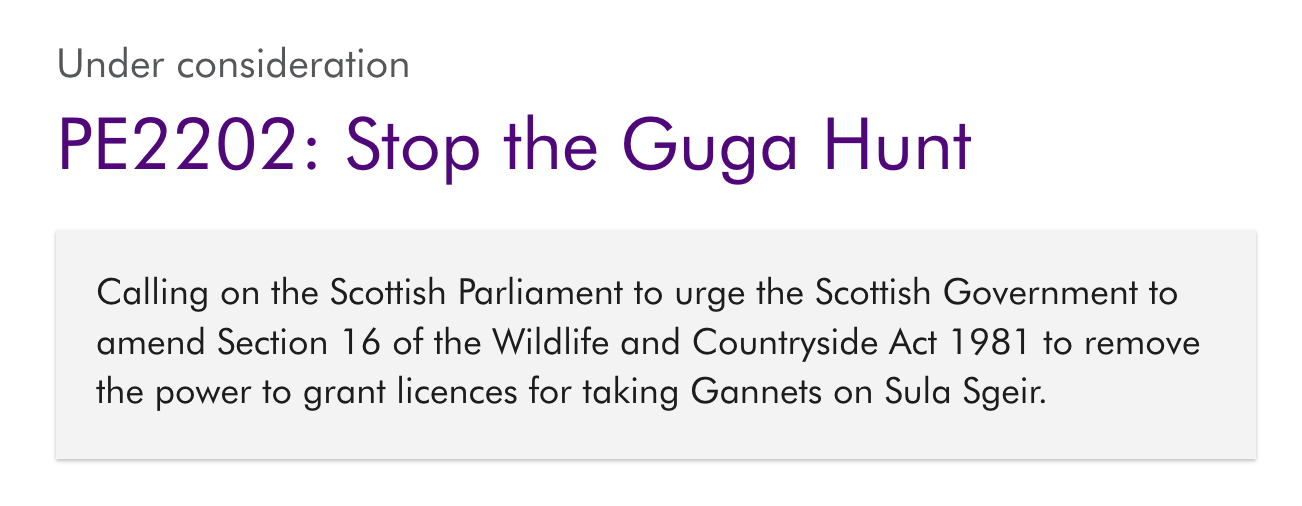 Please SIGN THE PETITION set up wildlife photographer Rachel Bigsby Calling on the Scottish Parliament to urge the Scottish Government to amend Section 16 of the Wildlife and Countryside Act 1981 to remove the power to grant licences for taking Gannets on Sula Sgeir