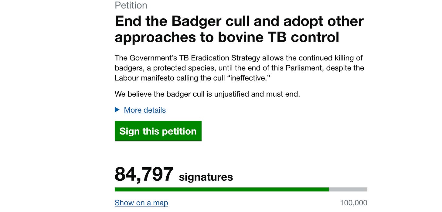 Rob/Protect the Wild, have you tried mentioning this petition to other badger friendly charities (such as the badger trust, the save me trust, Wild justice, *born free, *Avaaz etc) to try and help grow it? The reason why I ask is because 2 other petitions for animals on the government website ("End the use of cages and crates for all farmed animals" and "Ban driven grouse shooting") have both gotten over 100,000 signatures each and I know the "End the cages" petition was backed up by more than 1 charity (Four Paws, compassion in world farming and the RSPCA I believe).