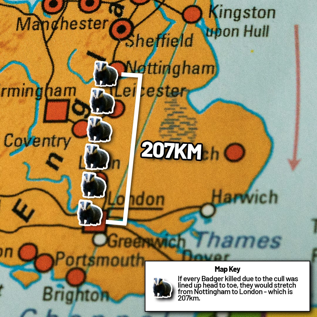 To help put this staggering figure into perspective, my colleague Curtis created a powerful graphic: if every dead badger were laid out head to tail, they’d stretch the entire distance from Nottingham to London.