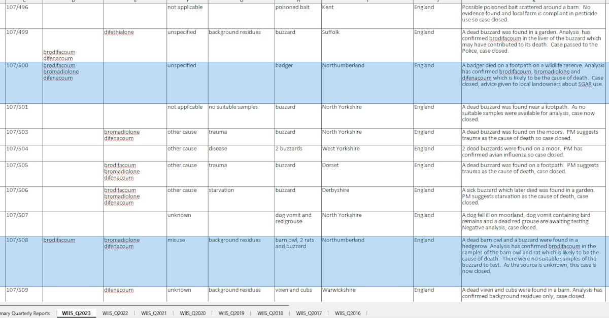 “documented five dead buzzards, one dead barn owl, a dying badger and numerous dead corvids, in the immediate area around the chewed Brodifacoum sachets and dead rats.