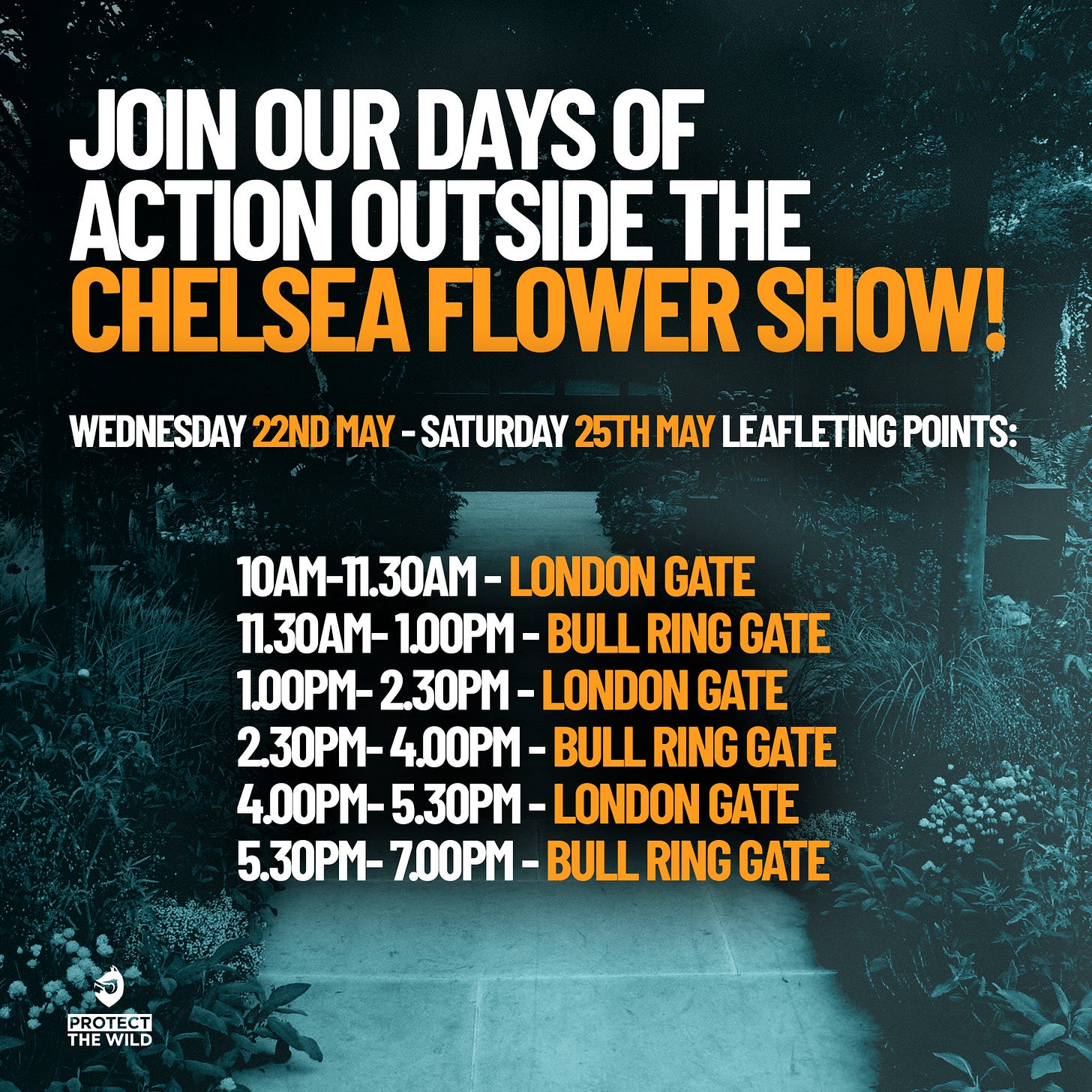 In a follow up to my recent email regarding the demo outside the Chelsea Flower Show, I’m happy to let you know that as well as being outside the show on Saturday 25th May, I will also be leafleting at the main entrance points from 10am to 7pm on Wednesday 22nd May and Thursday 23rd May and from 10am to 4pm on Friday 24th May.