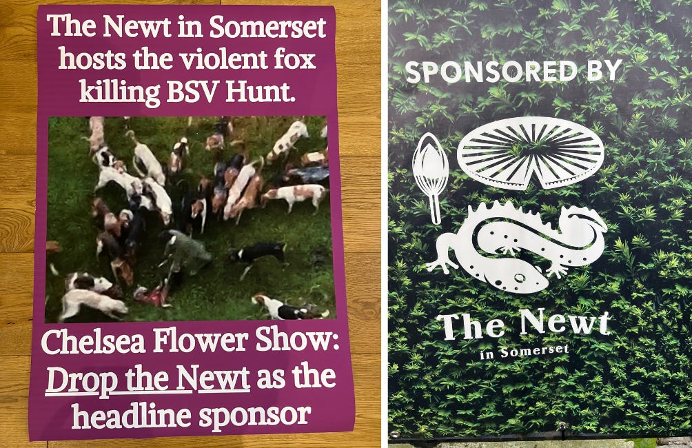 This is to protest the Chelsea Flower show being sponsored by The Newt in Somerset who allow one of the worst fox hunts in the country to meet on their land. And we will be handing out as many leaflets as possible throughout the week to deliver our message to attendees that The Newt in Somerset should ban hunts from their land.