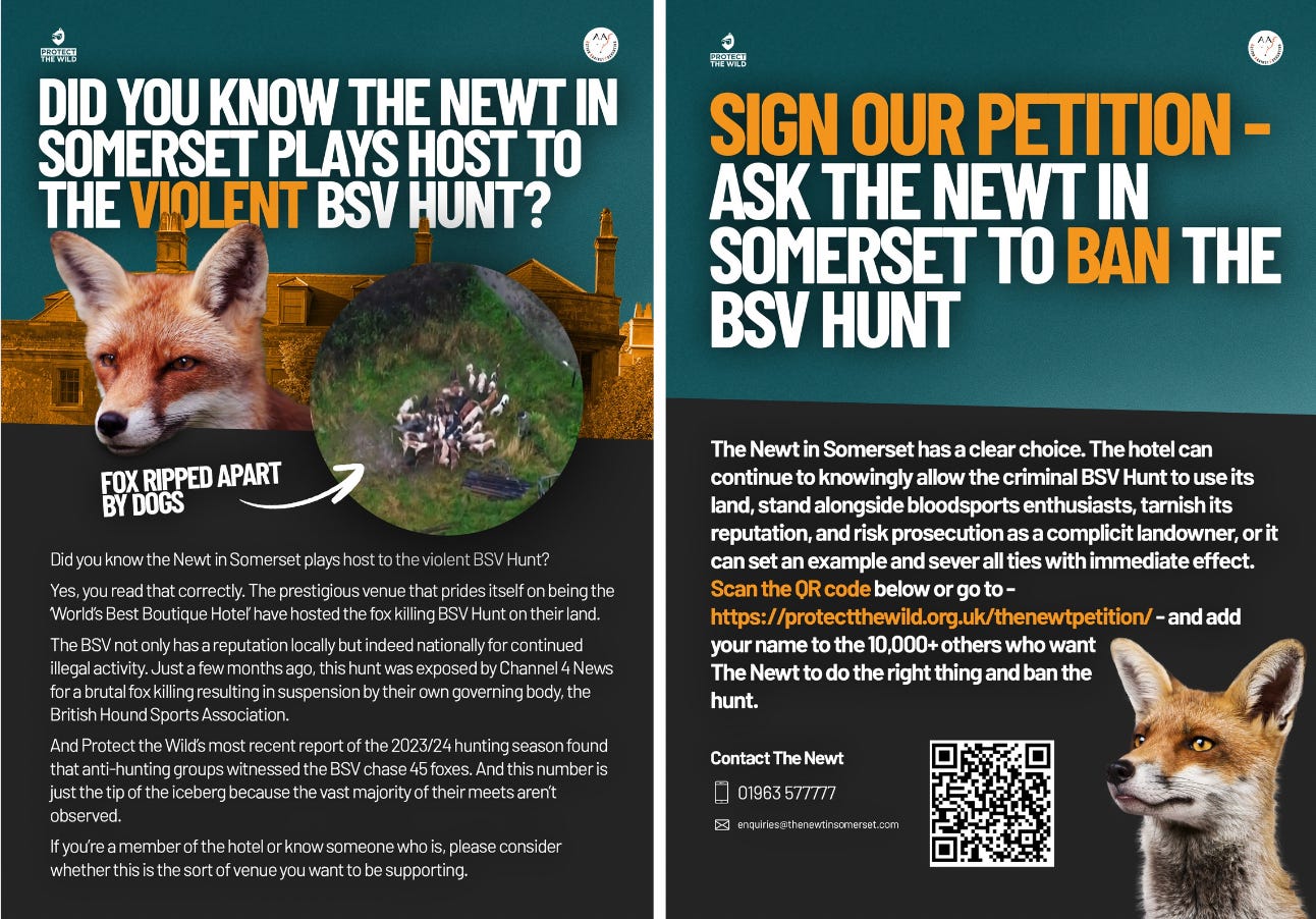 A big thank you to every single one of you for supporting the campaign for The Newt in Somerset to ban the BSV Hunt from their land. Below are the online actions you can take if you aren’t able to make our London days of action.
