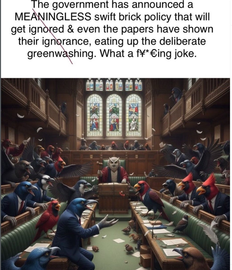 It’s hard to argue that mandating developers to incorporate one Swift brick into the 5,000 to 7,000 bricks that are used in the average house build would restrict the government’s loosening of planning regulations in any way at all. It is such a ridiculously easy win, it makes no sense whatsoever to deny themselves it.