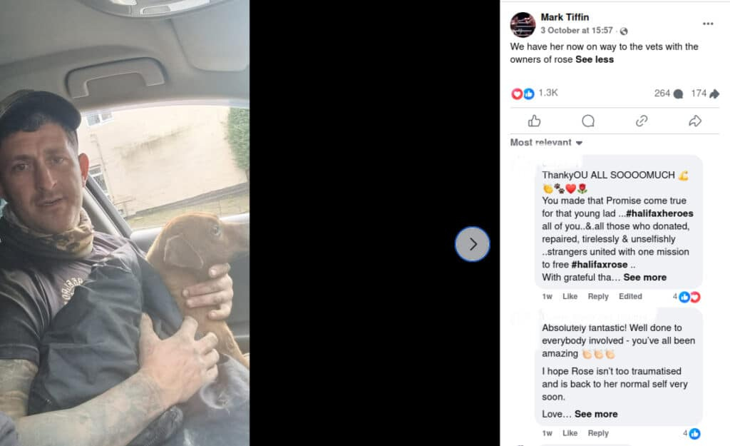 Tiffin posted numerous videos on his Facebook page of the rescue operation, asking people to donate. He also posted photos of himself with the dog after she was saved.