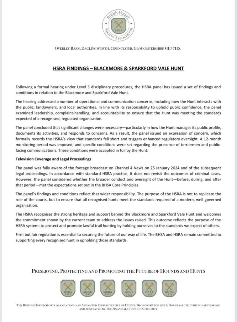 Finally, the Hound Sports Regulation Authority has published its tokenistic assessment of the behaviour of the notoriously violent and lawless Blackmore and Sparkford Vale (BSV) hunt. The Hunt has been placed under "enhanced regulatory oversight" until May 2026.