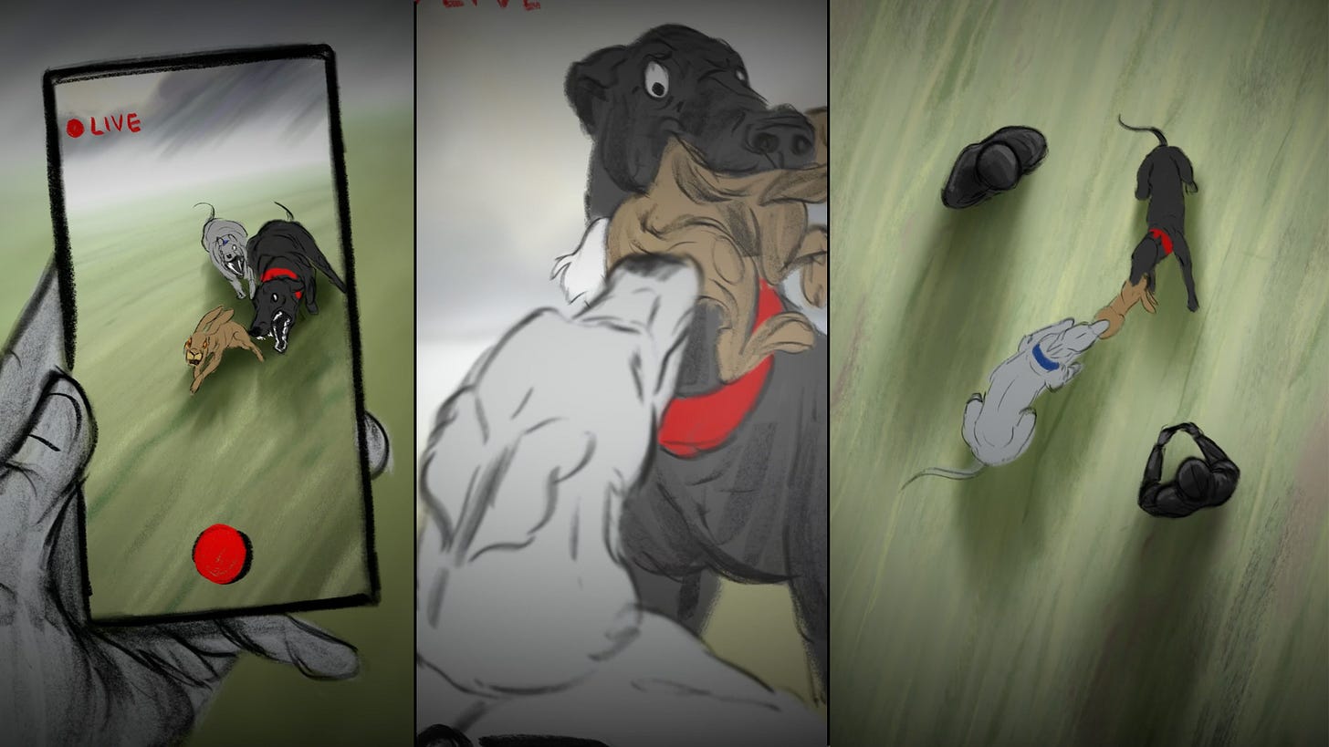 This often results in a tug of war between the two dogs over the hare which unsurprisingly causes immense pain and suffering to the terrified animal being ripped to pieces.