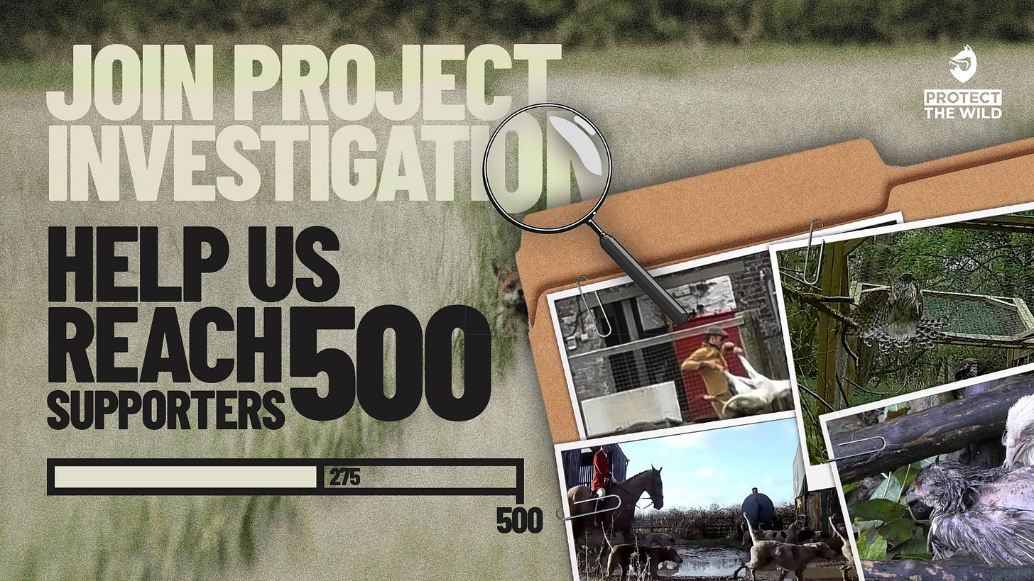 That’s why we’re launching Project Investigation, a fundraising drive to raise £2,500 a month so we can run investigations without compromising our frontline support. We’re asking 500 people to donate just £5 a month — enough to fund consistent, fearless, high-impact work that exposes cruelty and forces change. You’ve seen what our covert work can do: our Beaufort and VWH Hunt investigations shattered the trail hunting myth, our badger cull footage aired on the BBC and challenged government policy, and our exposés on raptor persecution are helping take down the shooting industry. We want to do even more — but only if we have the resources to keep going. Please, if you believe in what we do, be one of the 500 and help fuel this fight.