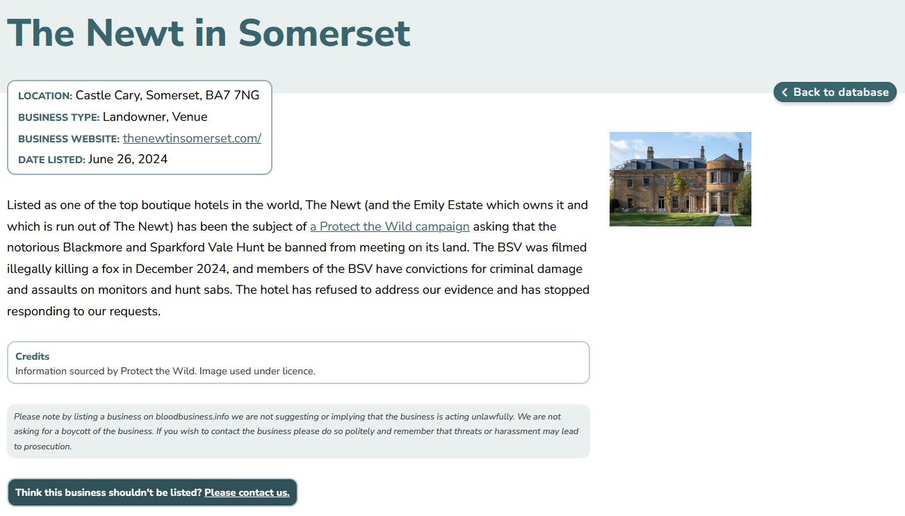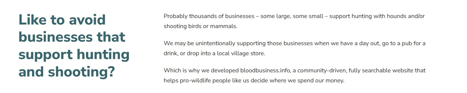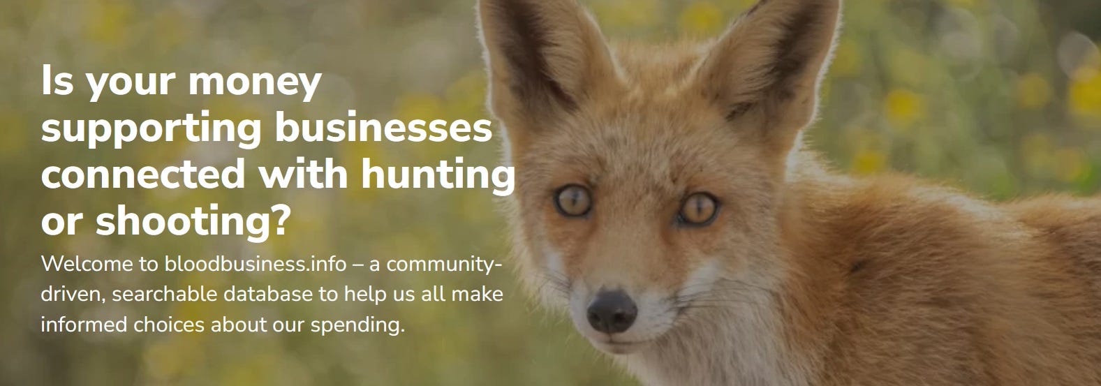 At the heart of our new project is the bloodbusiness.info website. We describe it as a ‘searchable database to help us all make informed choices about our spending’. And that’s exactly what it is. A searchable ‘list’ of businesses that support hunting with hounds and/or shooting birds or mammals (‘live targets’). Everything from retailers to pubs and hotels, suppliers and digital media - if they support ‘hunting or shooting’ we aim to list them.