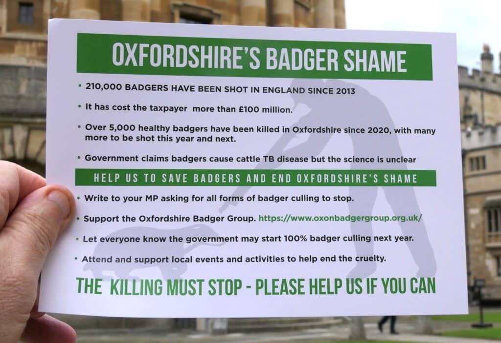 The message (given out on leaflets like the one below) was that the badger cull must stop. And it certainly mustn't be expanded into another kill zone in Oxfordshire.