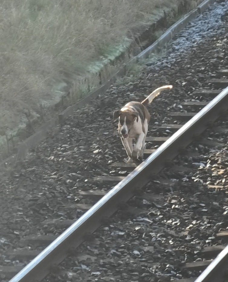 A BSV hound is photographed on a railway track on 25 November 2023. Photo by North Dorset Hunt Saboteurs