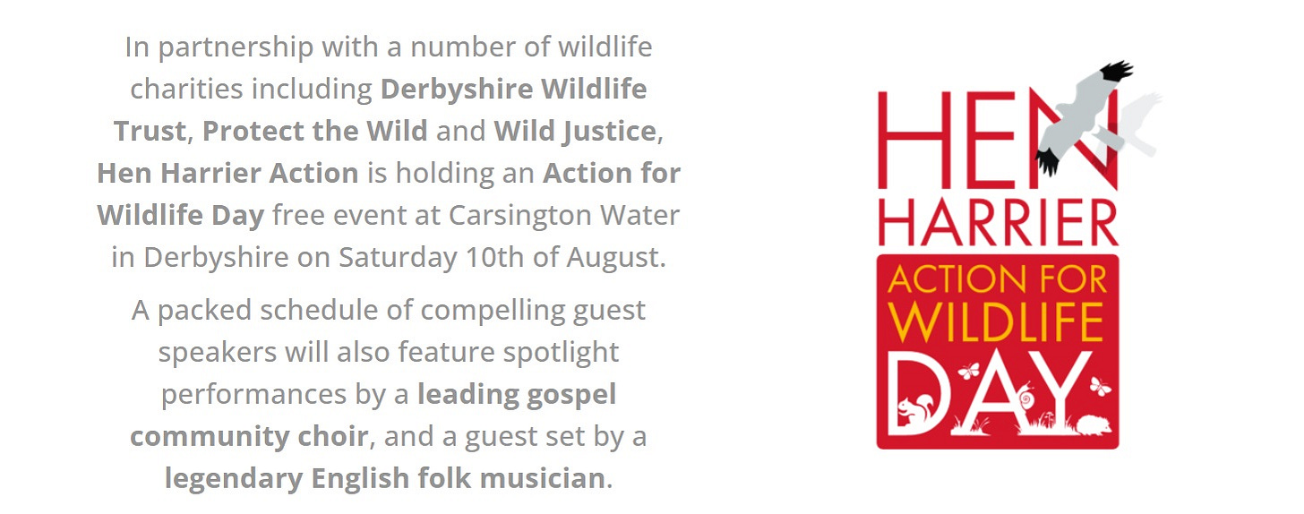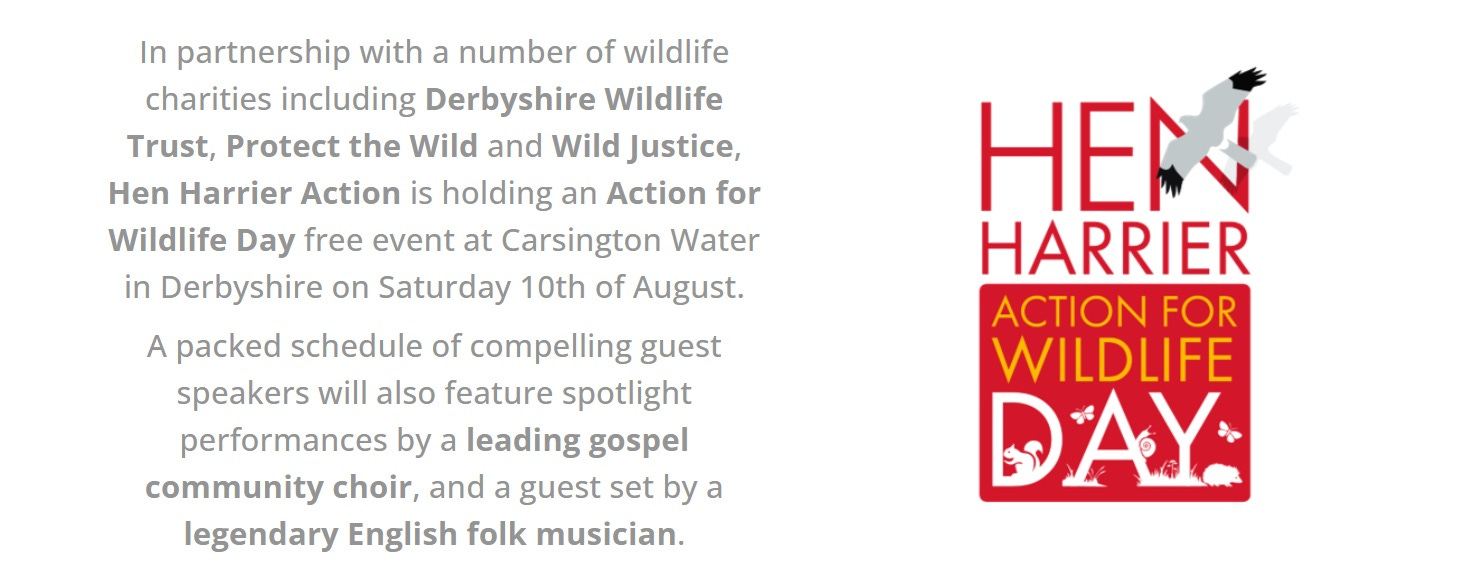 We are excited to announce that we are co-sponsors (with Derbyshire Wildlife Trust and Wild Justice) of Action for Wildlife Day, an event at Carsington Water organised by Hen Harrier Action. Taking place on 10 August we will be bringing our message of ‘empowering people to protect British wildlife’ into the Peak District - and of course explaining why we want to do everything we can to end the bird shooting industry. Both Rob and I are speaking at the event making this an excellent opportunity to showcase Protect the Wild. We are really looking forward to meeting supporters and colleagues alike, so do please stop by our stand and say hello!