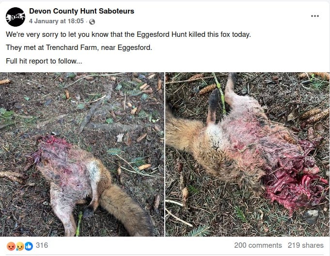 Devon County Hunt Saboteurs reported the killing of the fox, which took place on 4 January. The group shared heartbreaking photos on Facebook. Hounds had torn off the whole upper half of the fox's body: