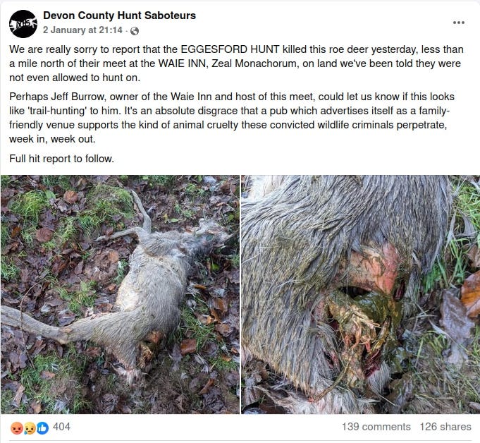 Just three days earlier, on New Years Day, the sabs reported that that the Eggesford had killed a roe deer while trespassing on land. Hounds chased a number of animals that day, beginning with a fox, as well as two other roe deer. The sabs said: