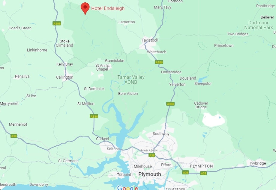 Tamar Valley AONB (now Tamar Valley National Landscape) and the Hotel Endsleigh. Copyright Google Maps
