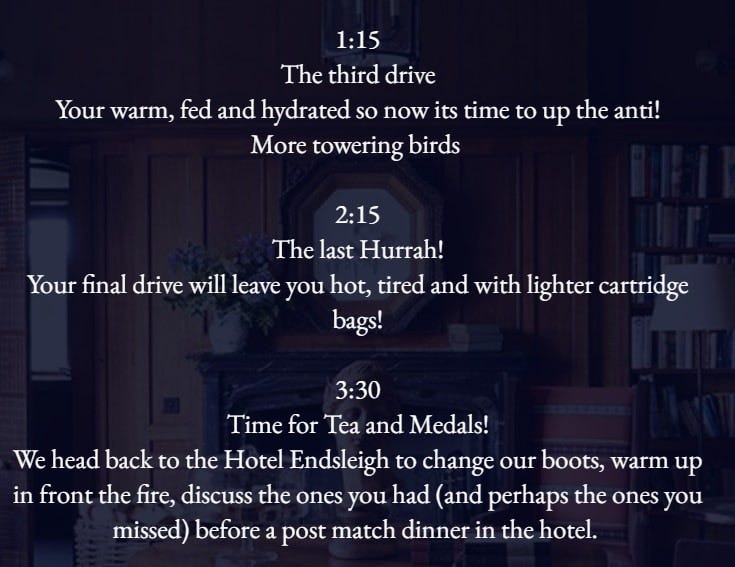 It describes the shooting as taking "advantage of the deep Tamar valleys to offer an outstanding spectrum of high-bird drives with picturesque pegs along the Tamar Valley". The description of a 'typical day' is written in the sort of effusively self-congratulatory language that reinforces just how different - and unempathetic - people who sell killing birds for a day out really are (and it's not just pheasants they are casual about, it's spelling and grammar too as the screenshot below demonstrates):