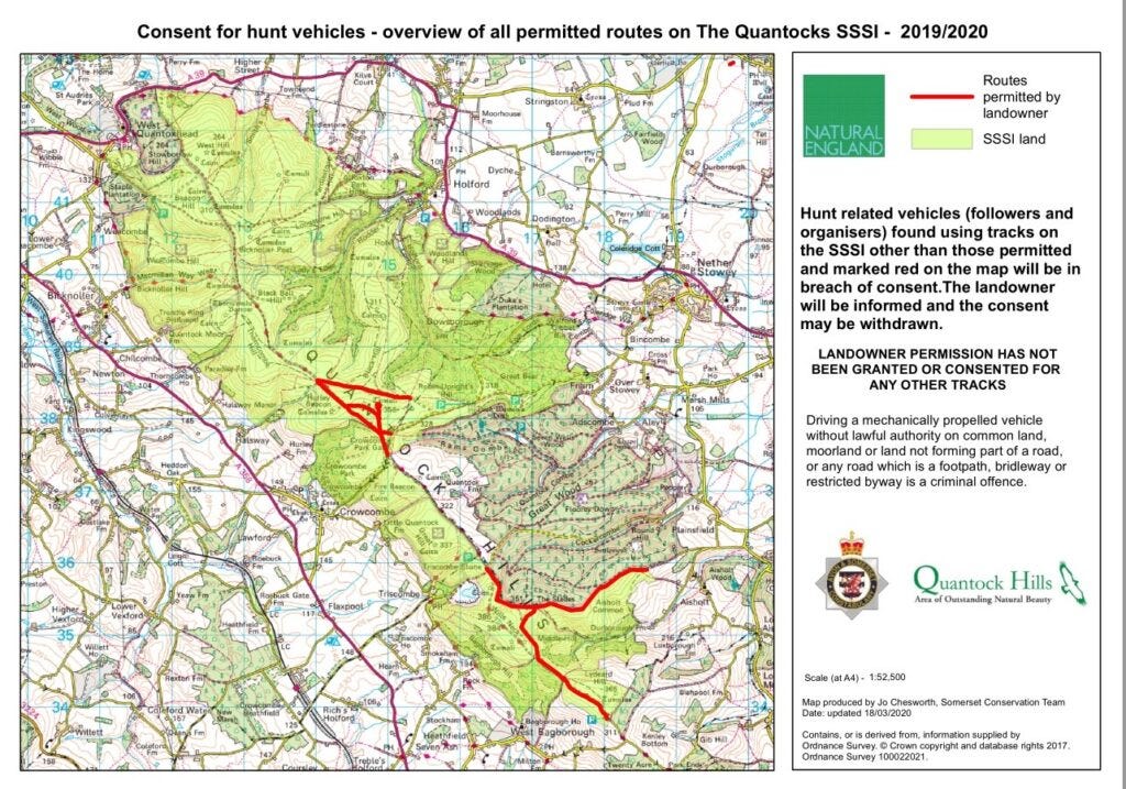 Both Natural England and Avon and Somerset Police CAN deal with individuals committing these offences. Under Section 34 of the Road Traffic Act using a mechanically propelled vehicle without lawful authority on common land, moorland or any footpath or bridleway is an offence. Despite many reports made over the years by locals and by campaigners there is a serious lack of police action in this respect. (That could be because they're running scared. The Secret Monitor knows for a fact that the hunt once drove at the special who used to cover the Quantocks, trying to run him over in the middle of Holford village!).
